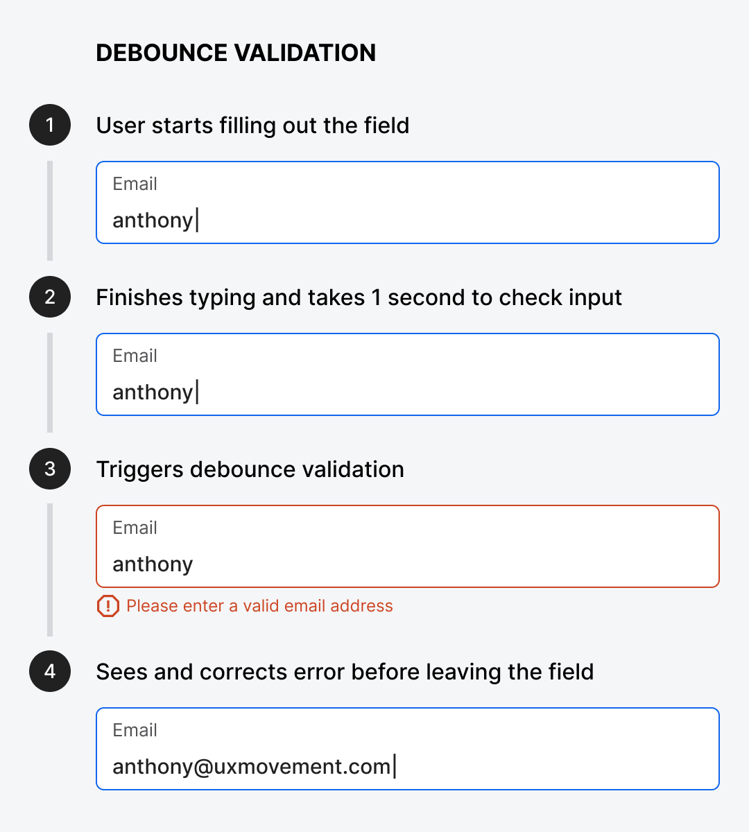 No longer should they have to click back to fix an input error. Instead, validation should occur the moment they truly finish typing, for a smooth and seamless interaction.