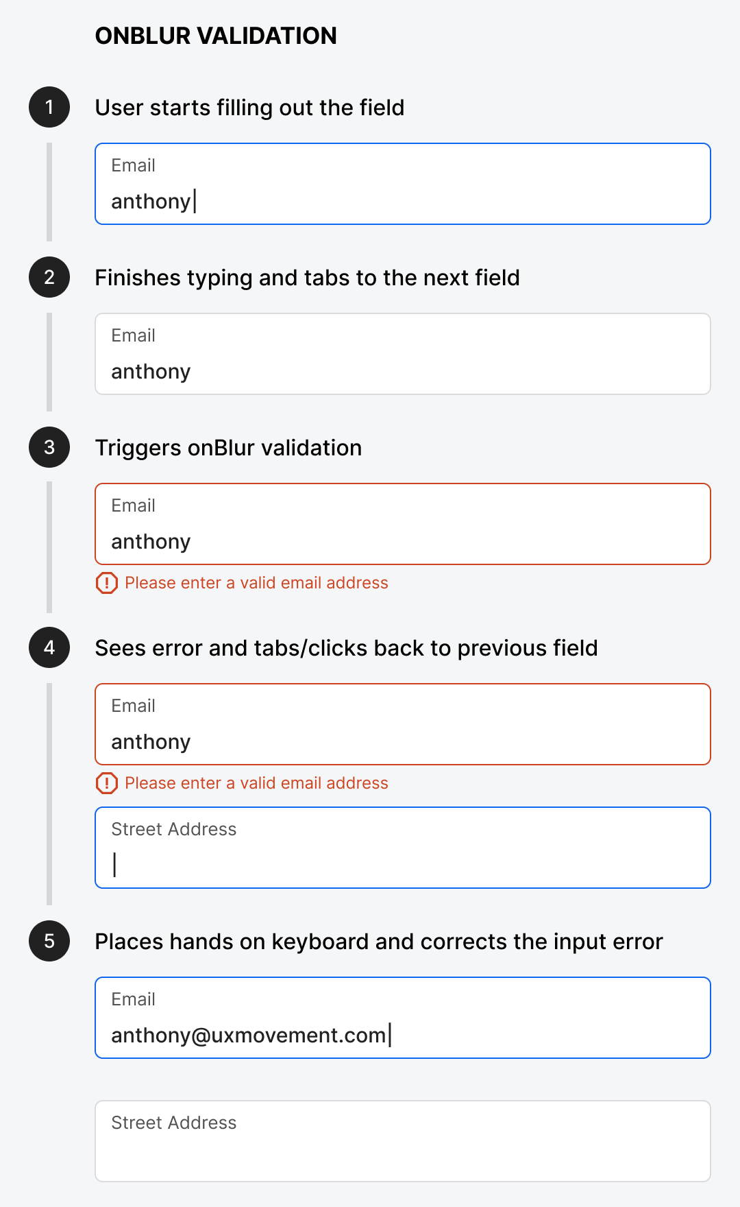 The current practice of onBlur validation is widespread because a field losing focus usually signals user completion. However, it also causes considerable friction because it requires users to retrace their steps to correct mistakes when their mental focus has shifted away from a completed field.