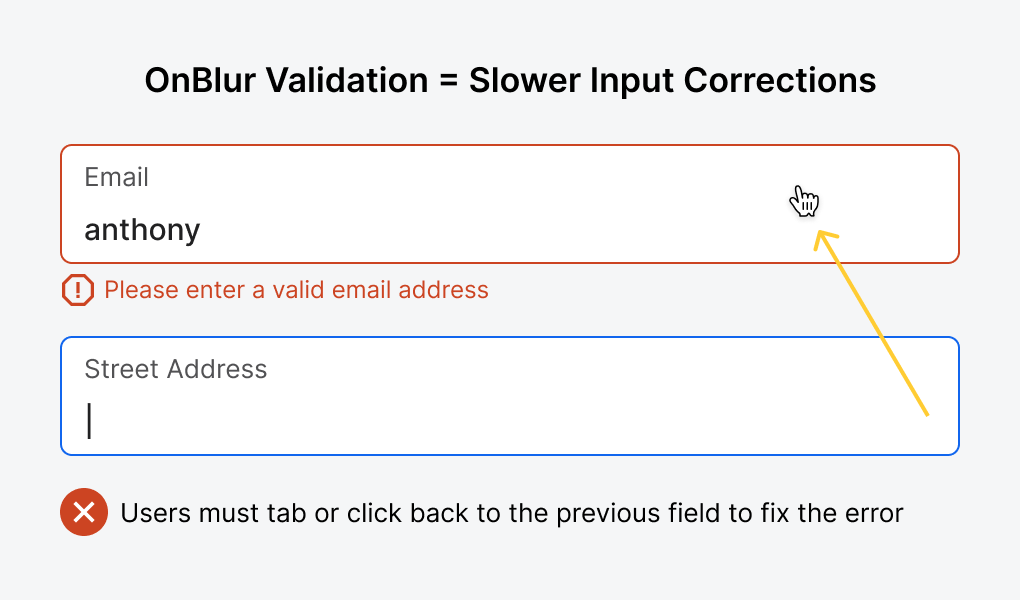 OnBlur events are still the default validation trigger on many forms today. However, this pattern is needlessly and surprisingly inefficient. The form only checks for errors when users leave a field. The benefit of this is that it ensures users have finished typing their input. However, the downside is that it forces a slow and awkward interaction where users have to click back to correct the error.