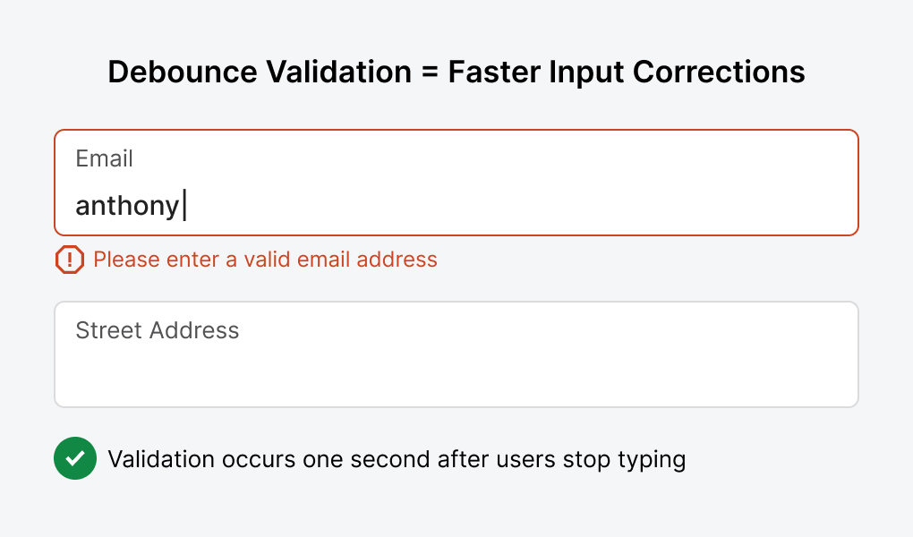 With debounced validation, input corrections are faster, local, and require no field hopping. Users can see and resolve errors as soon as they finish entering their input, without breaking their typing flow.