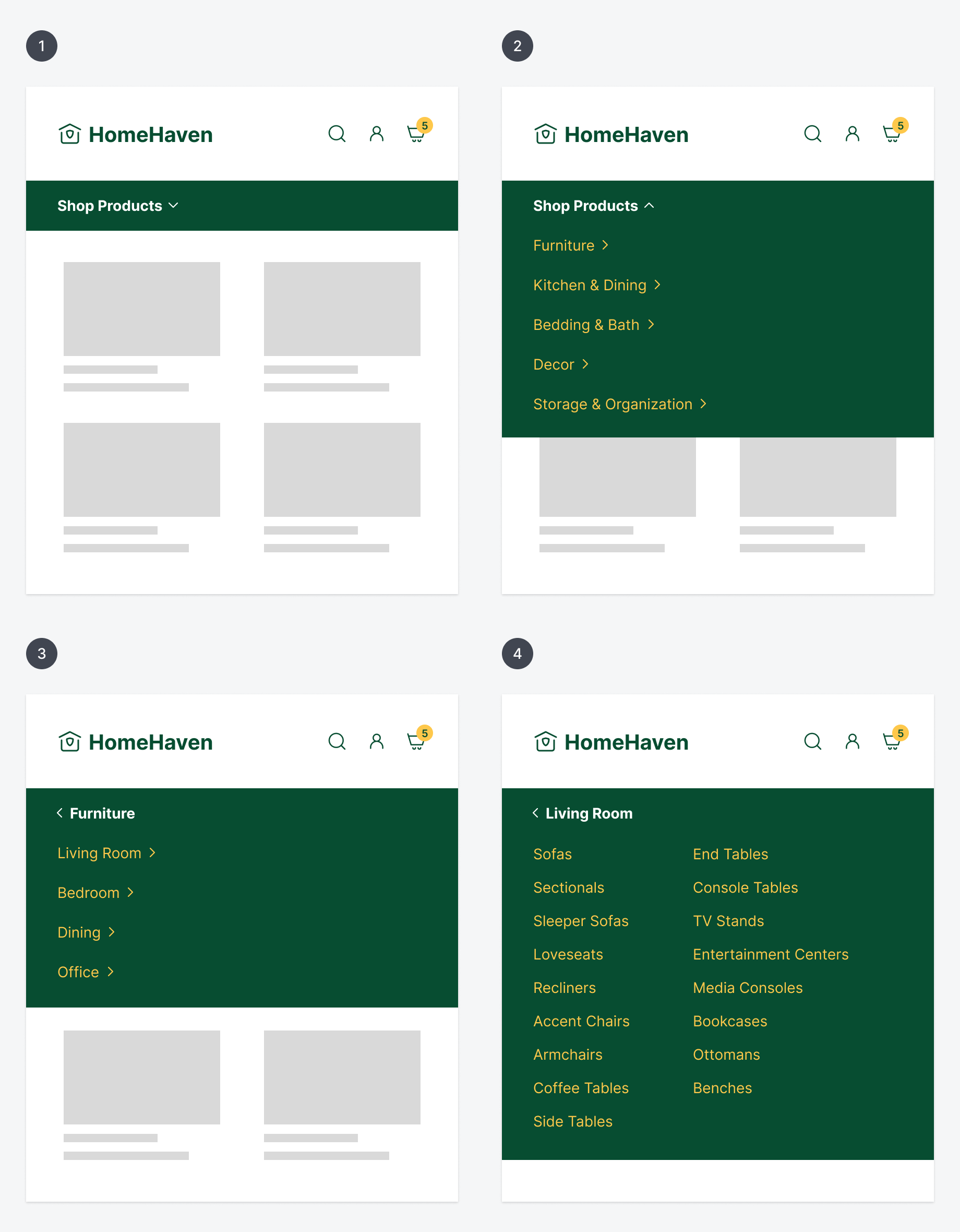 When users click the bar, it’ll drop down and display the main category items. As users click a category, the menu drills down to the next level of subitems, and so on until it can’t drill down further. If they navigate to the wrong level, they can click the back arrow button to reset.