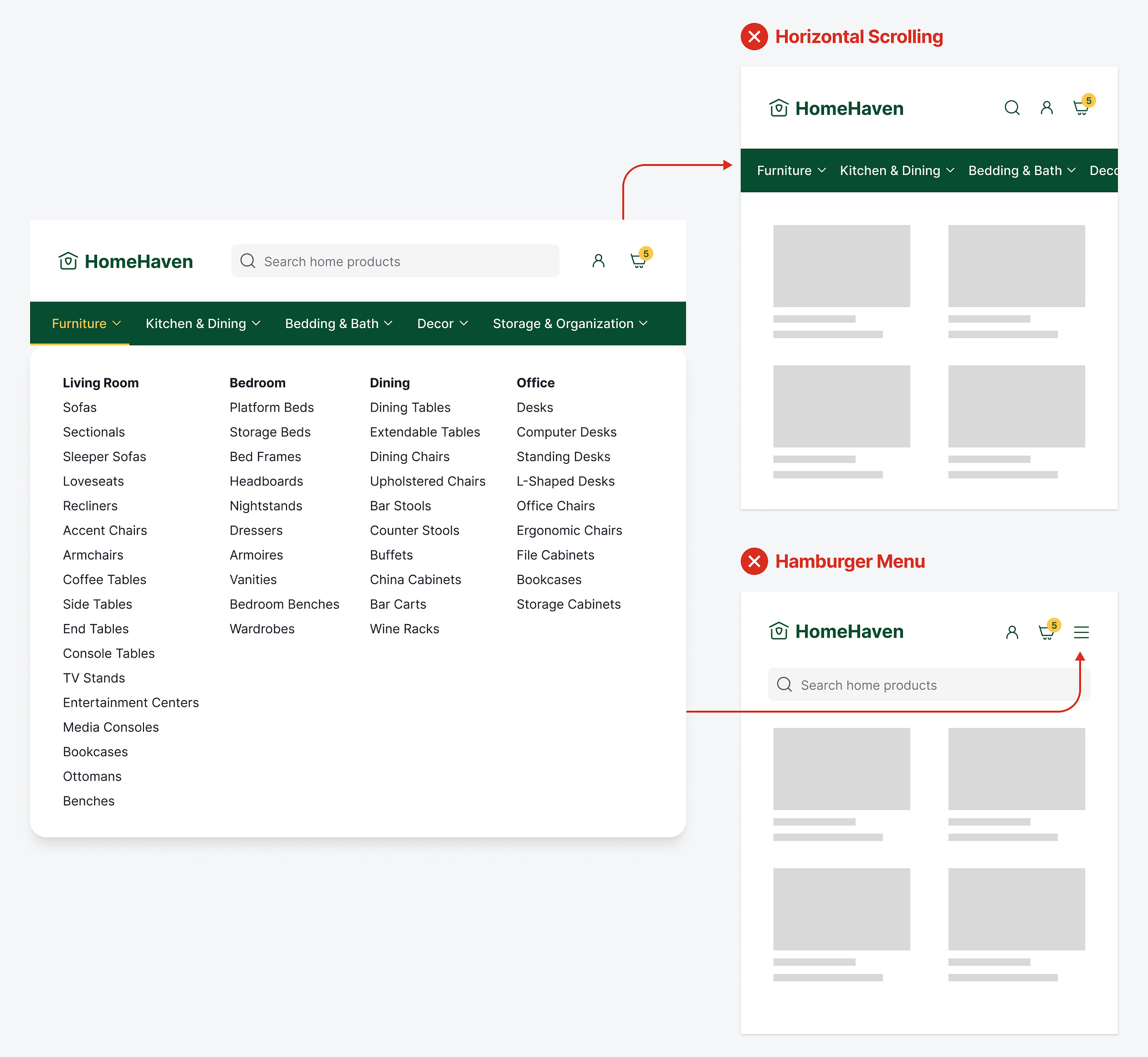 A better user experience would be to turn the navigation bar into an all-inclusive drilldown menu. In other words, the bar itself becomes the menu. Instead of displaying the category items, you would display a label that encompasses all the items, such as “Shop Products.”