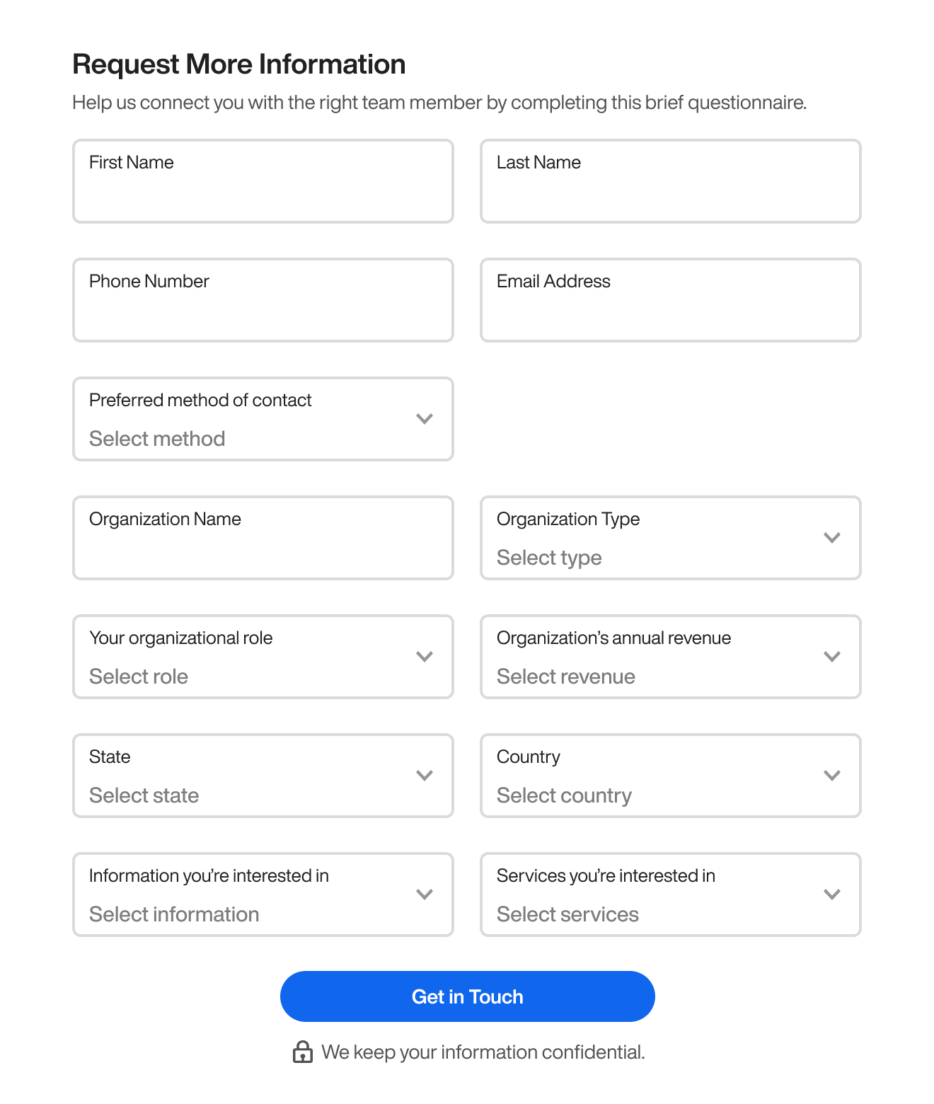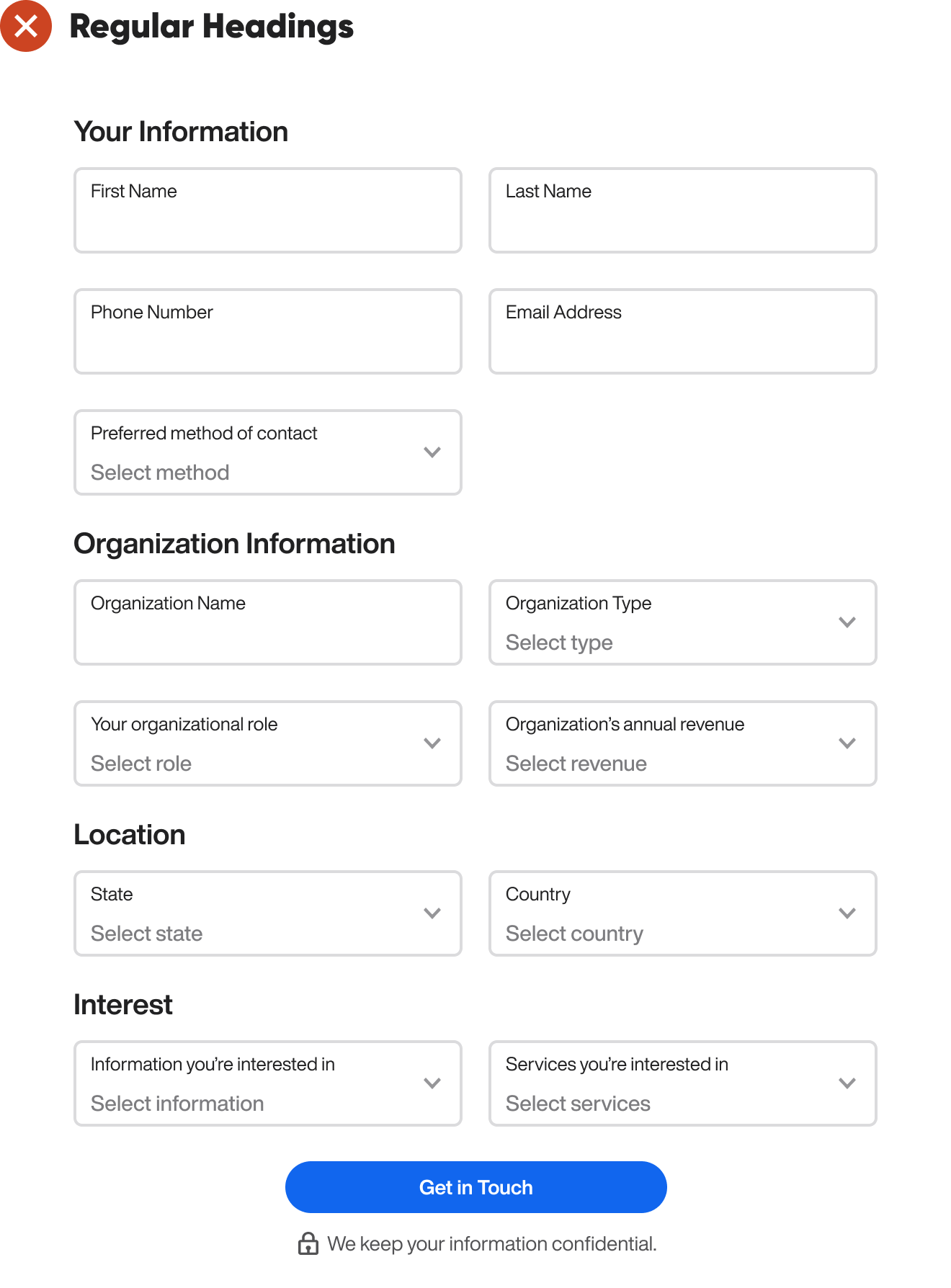 Fortunately, there’s a way you can compel users to fill out every field, no matter how long the form is. For example, this 13-field form contains several select menus that look overwhelming and intimidating. Most users would abandon this form and exit out of the website.