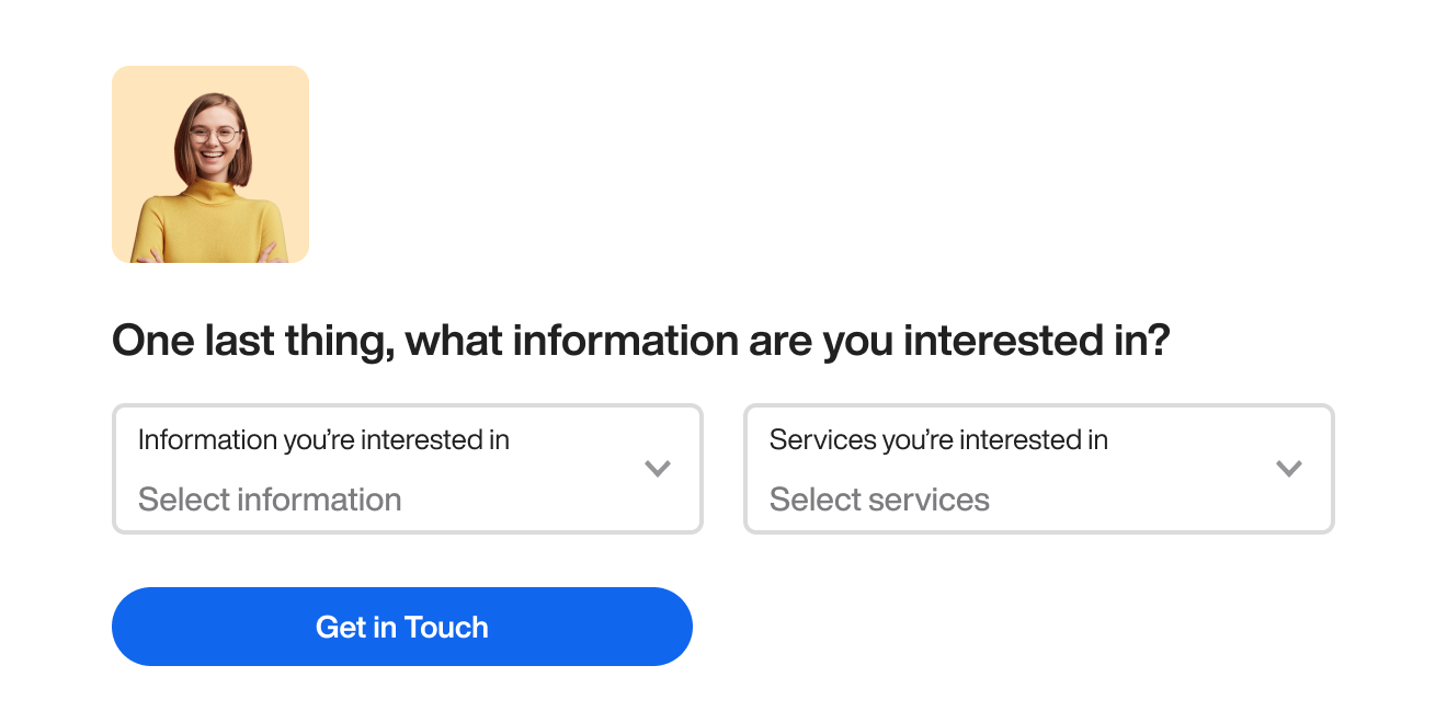 This heading includes “One last thing…” as a conversational segue before asking what information they’re interested in.