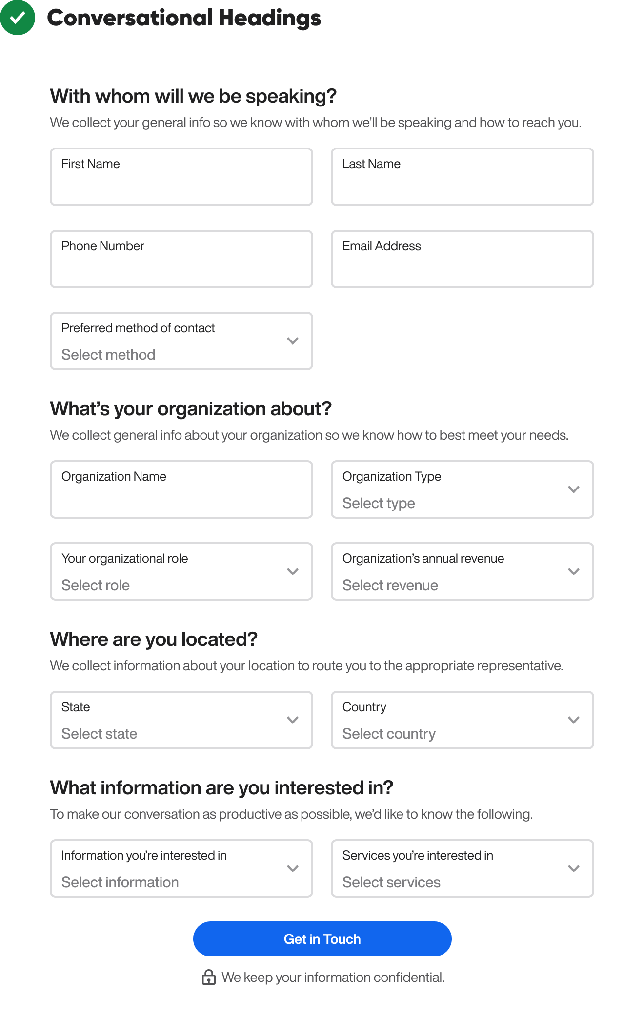 However, a research study found that how you frame your form significantly impacts whether users complete it. If you frame your form steps or sections conversationally, users are more likely to fill out every field. ( source ).