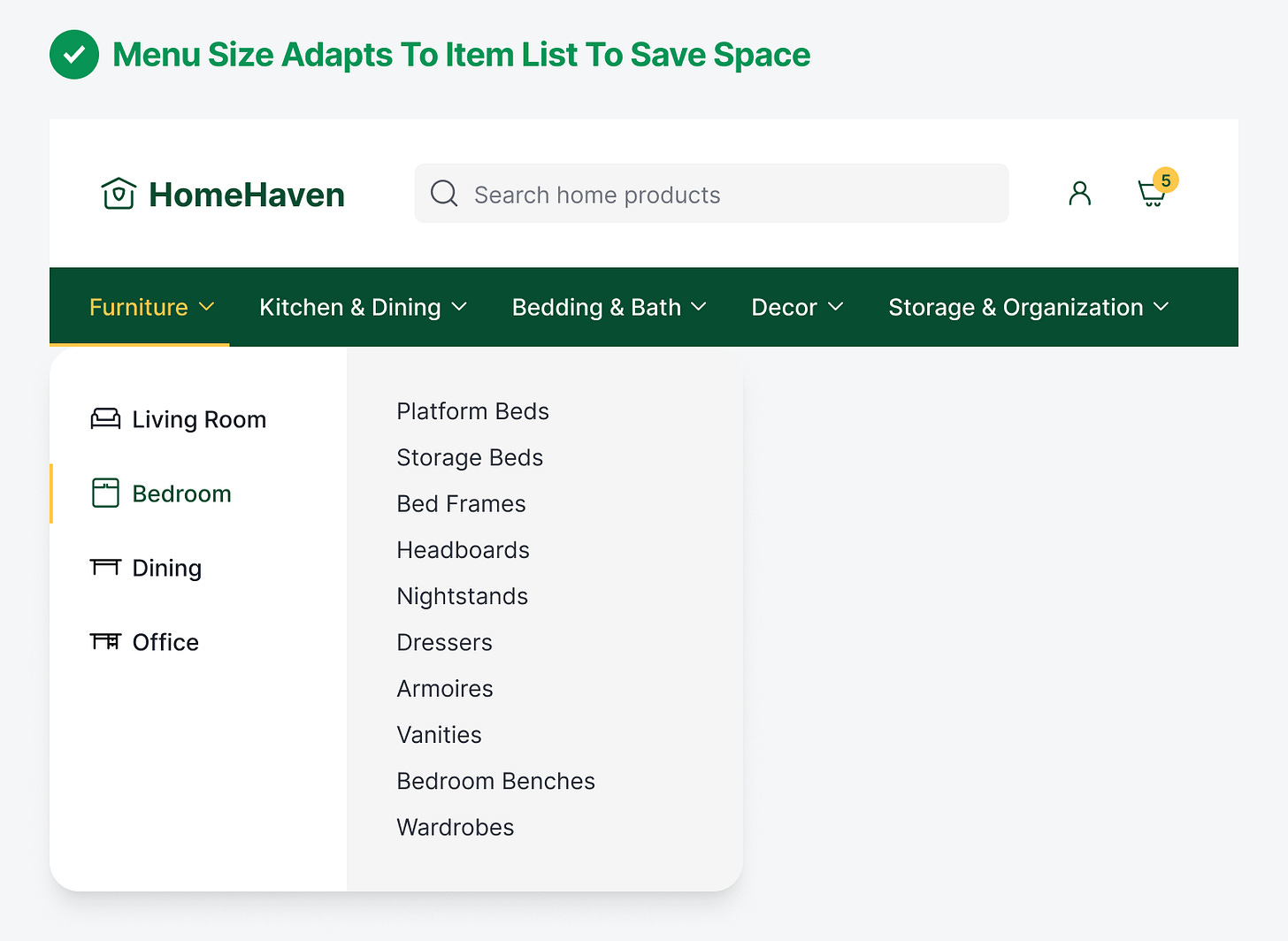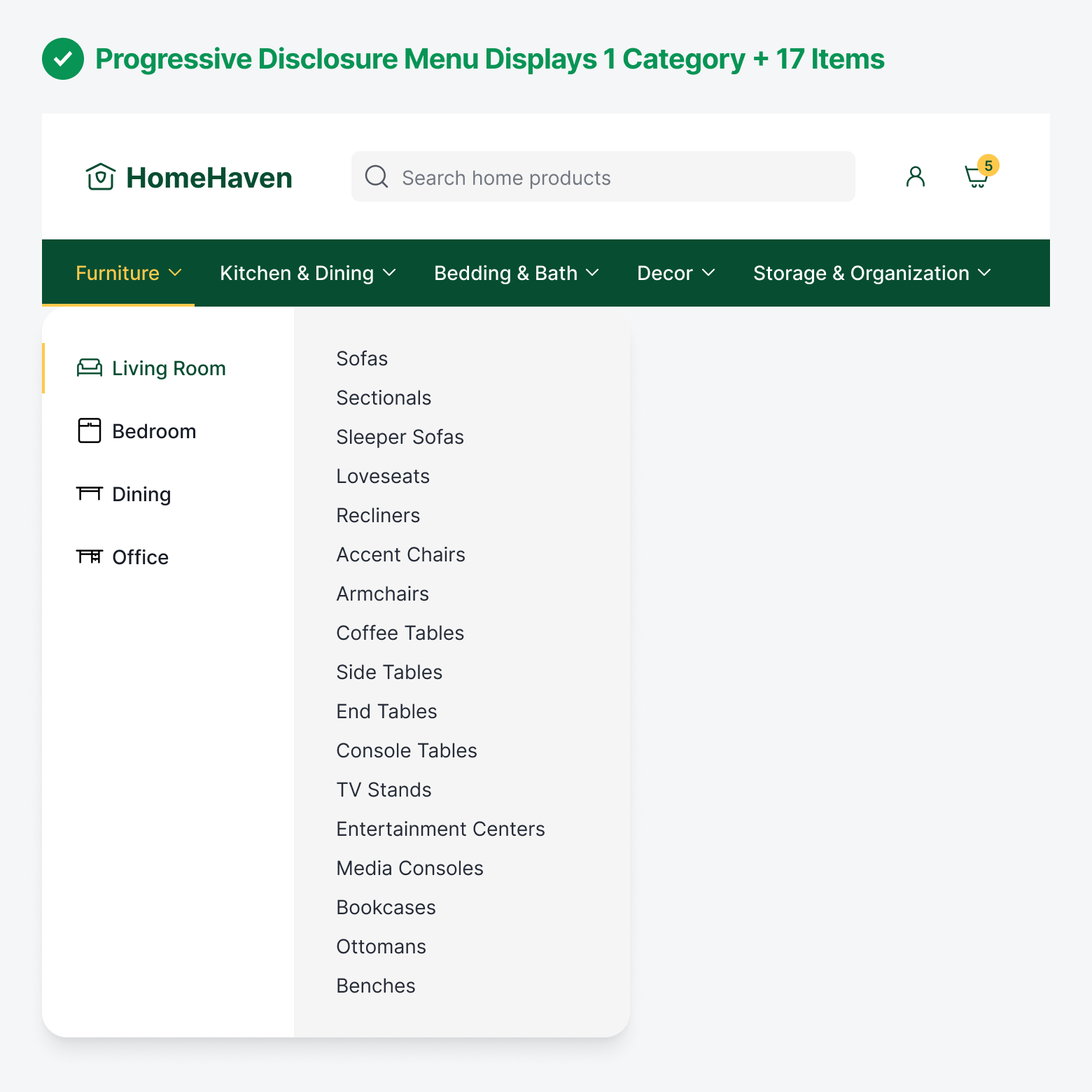 Progressive disclosure menus solve the cognitive overload problem by breaking navigation into manageable steps that align with how working memory actually works. Instead of presenting all 46 items simultaneously, users first see only the top-level categories: Living Room, Bedroom, Dining, Office.