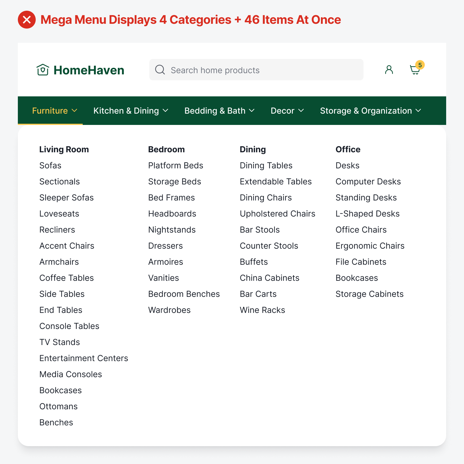 Imagine being confronted with 46 items organized into 4 columns. When users open the mega menu, they're trying to hold too many things in their working memory: the item they’re looking for, the category labels they're scanning, and their current position in the navigation structure. The result is working memory overload, where they feel overwhelmed, make slower decisions, or simply give up.