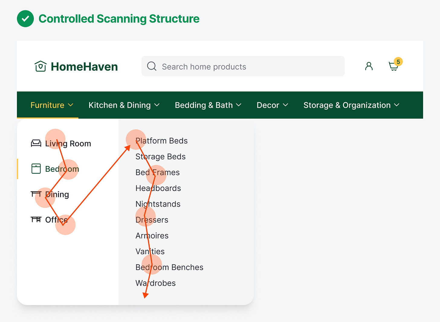 Mega menus don’t provide users with a controlled scanning structure. Users can start scanning from anywhere and end up anywhere, which can cause them to re-scan the same items. On the other hand, progressive disclosure scanning is more controlled. Users will consistently scan the categories on the left first before moving to the items on the right. This reduces randomness and chaos during scanning, which improves navigational efficiency.