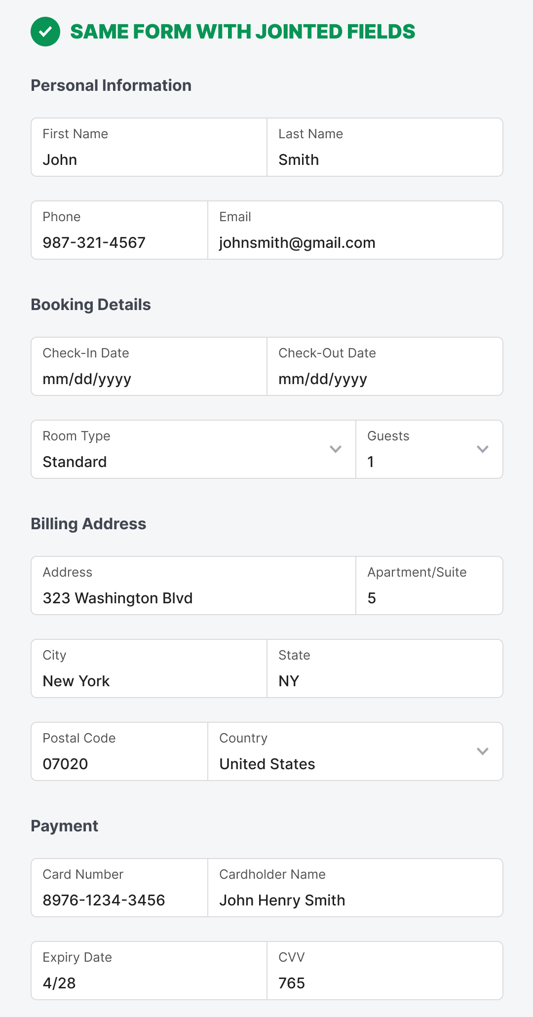 If you don’t want to lose more customers, stop displaying your fields in a multi-column layout. Instead, start using jointed fields. Jointed fields conjoin two related fields and remove the margin between them to create a stronger relationship.