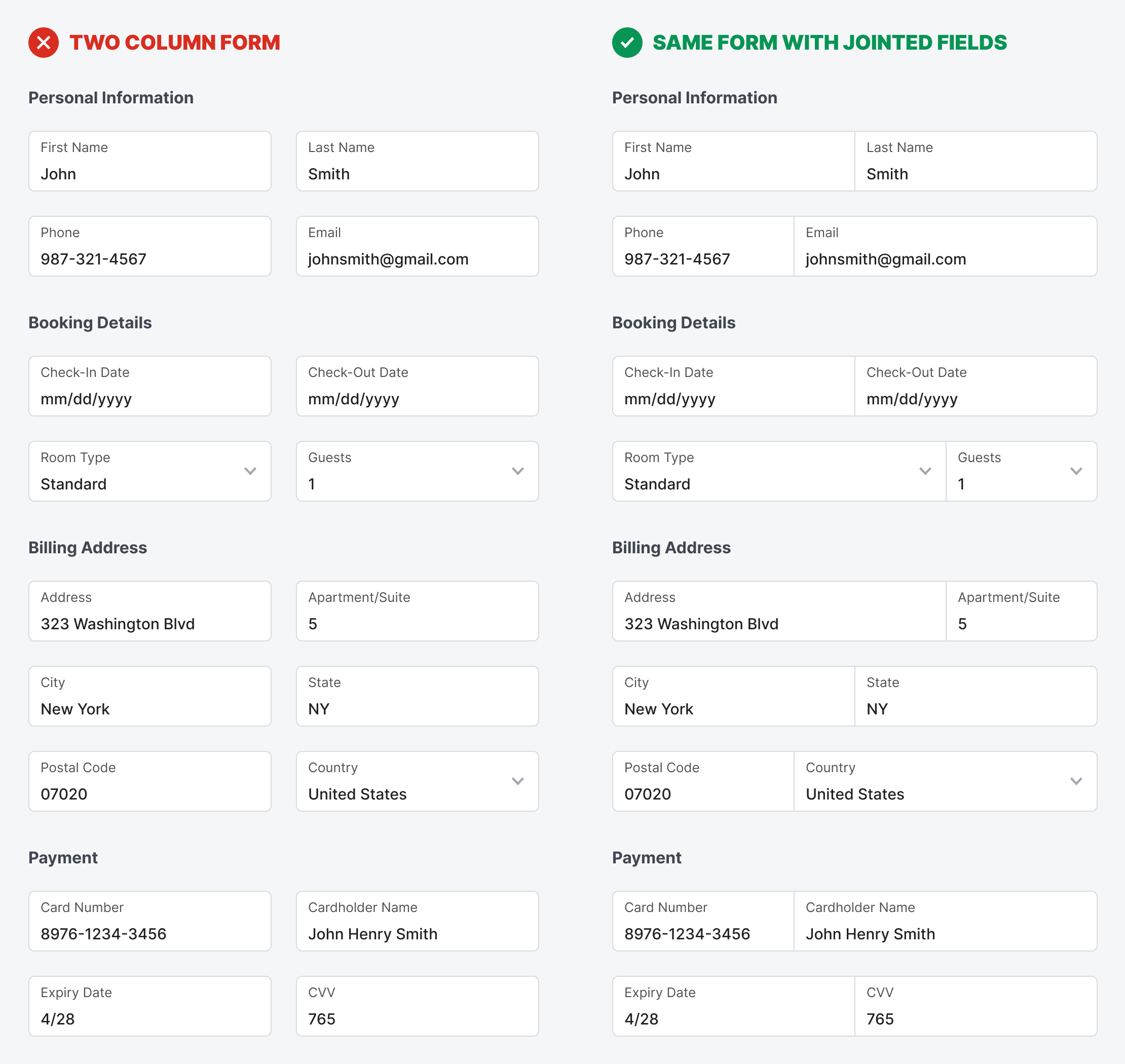 Above is what the two-column form looks like with jointed fields. It displays the same number of fields, but they no longer overwhelm users. The data relationships are distinguishable as you scan each row. The result is a lower cognitive load to complete the form.