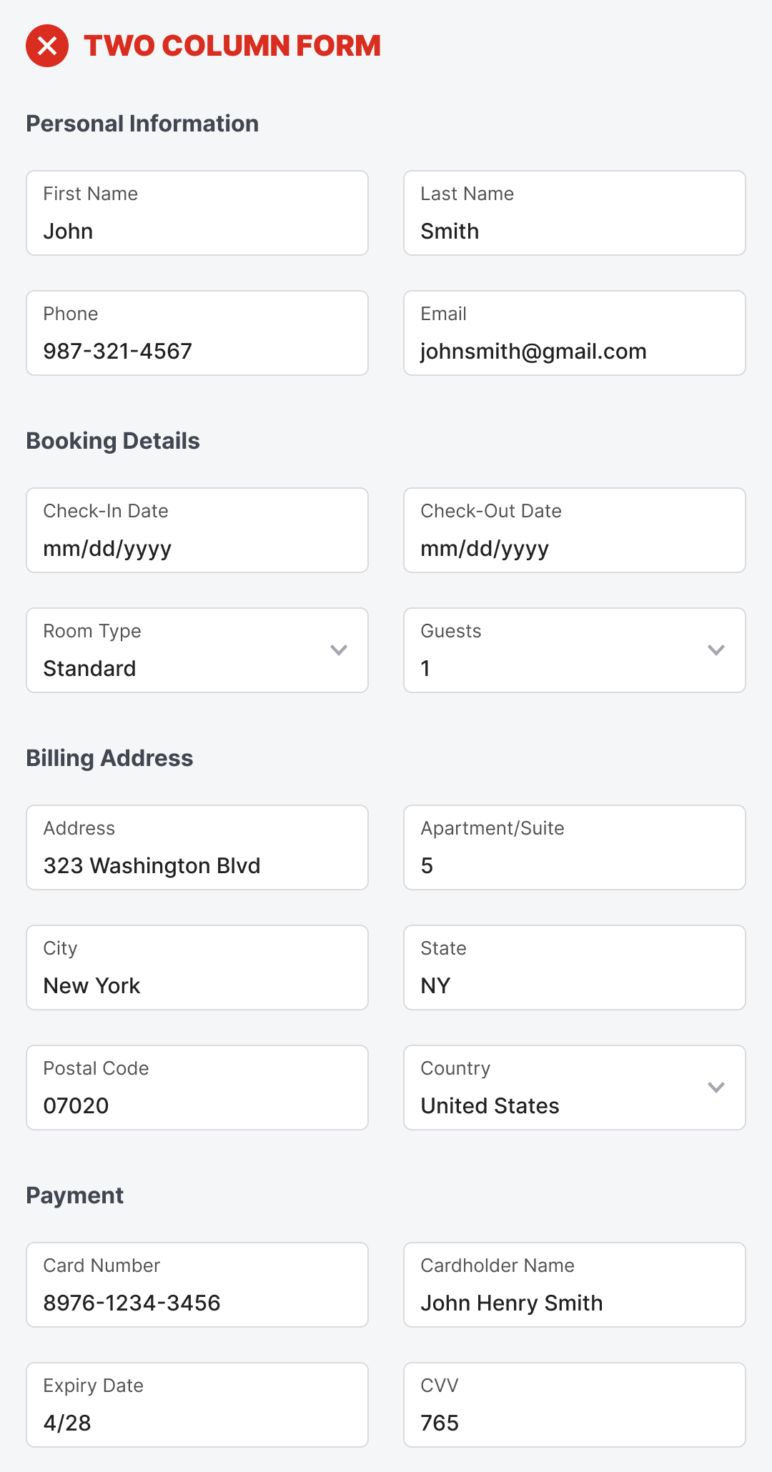 A form with eighteen fields and two columns is a dreadful sight to see. It’ll send users running for the exit and abandoning your app. What looks overwhelming to them isn’t only the number of fields, but the multi-column layout.