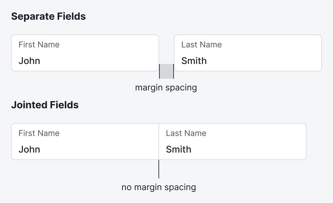 Jointed fields are a simple and effective concept and technique. You want to strengthen sibling relationships and reduce perceived data density. The margins separating these fields are what’s preventing users from making this cognitive connection. What started as 18 fields now feels like 9, a significant change that affects user perception and behavior.