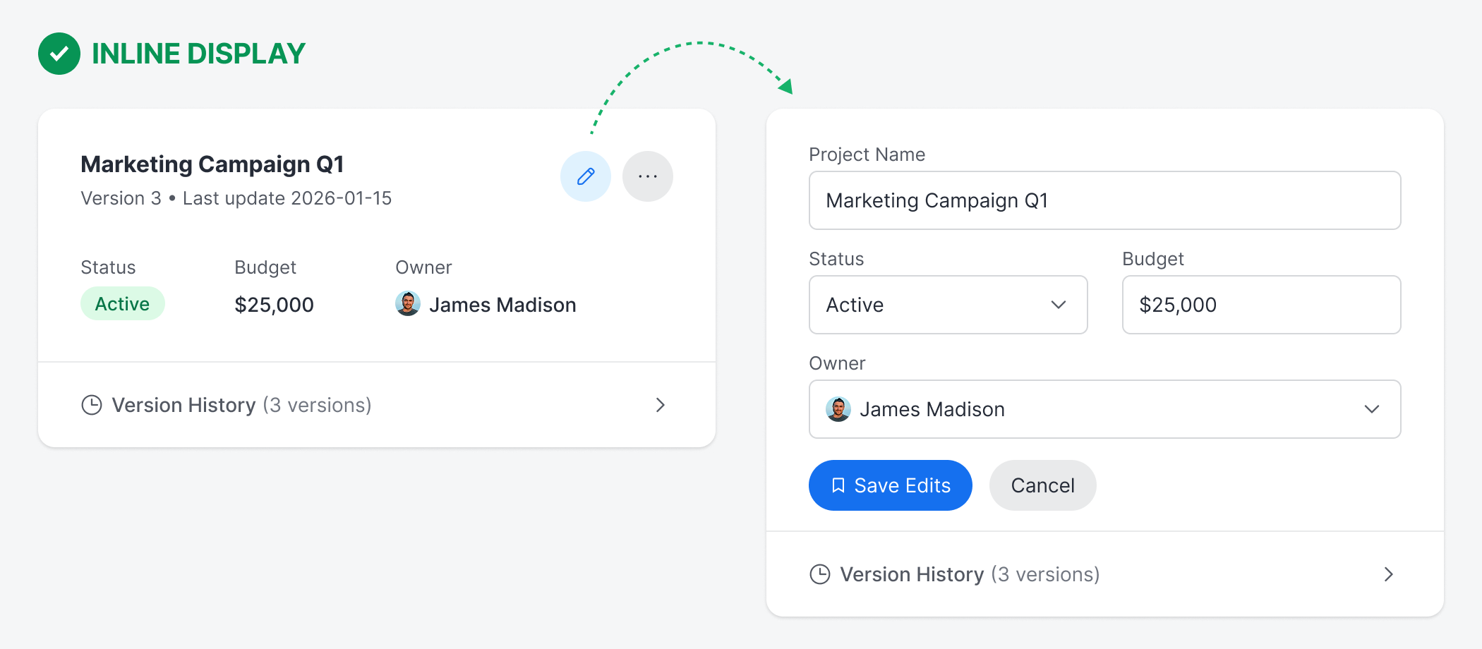 When a user clicks the edit button on an inline card, the card transitions to reveal the edit fields in place, replacing the read-only display. The transformation is immediate and spatial—users see where their edits are because they happen in the exact location they just clicked.