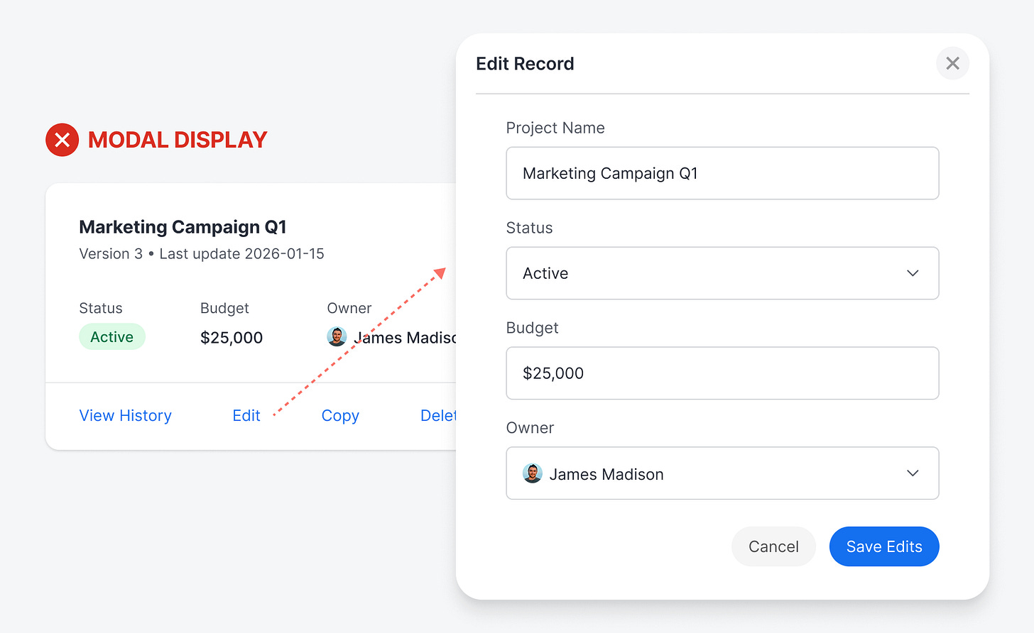 Not only that, but editing in a modal also means losing sight of the surrounding data that provides essential context. This modal interruption slows down the user’s workflow and creates friction between them and the data they’re editing. When it comes to editing, they can’t afford to make costly errors.