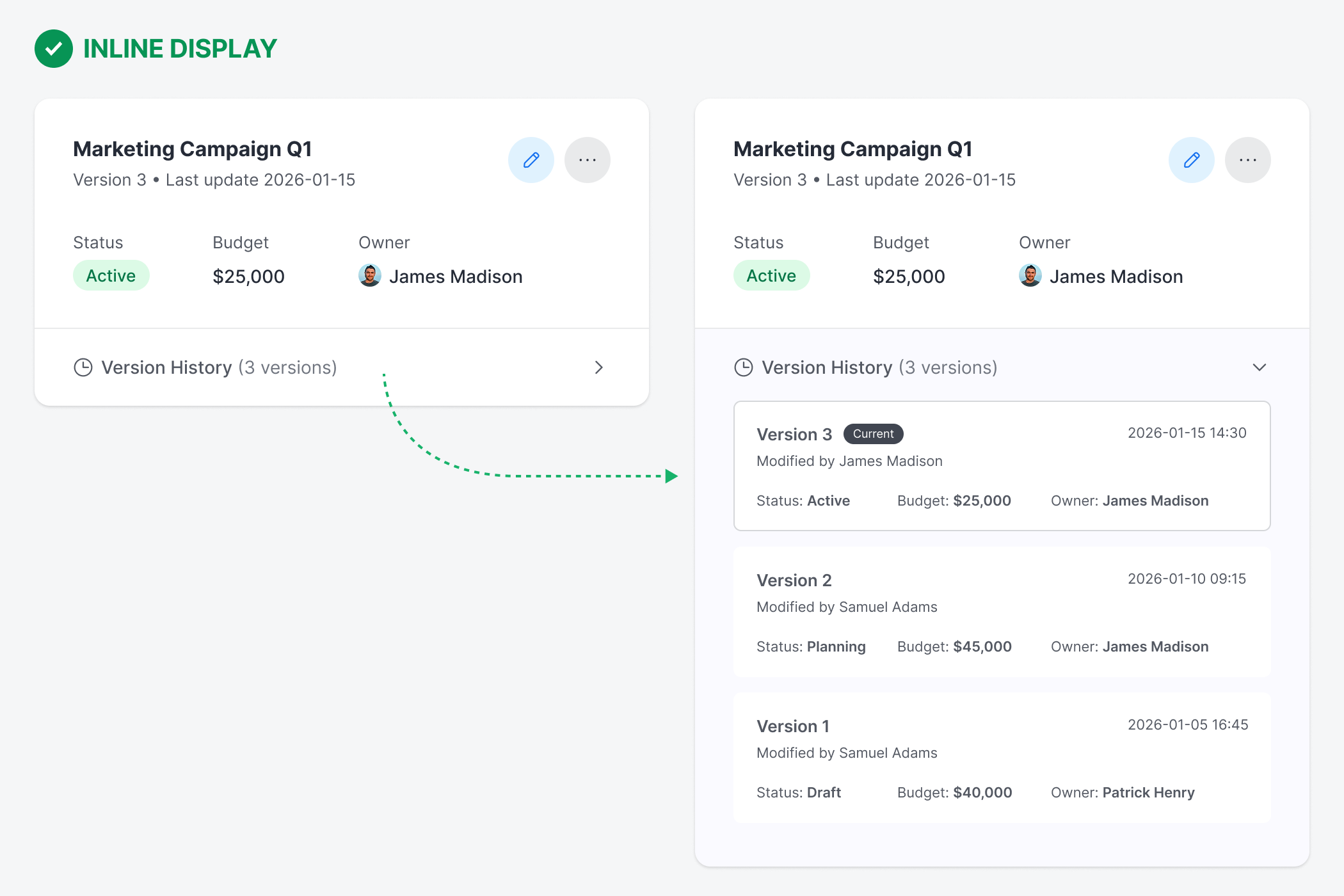 Inline cards offer a more intuitive approach that keeps the context fully visible. The version history expands below the card when users click on it. The expansion feels natural, like unfolding another section rather than being taken elsewhere. Because context remains intact, users can make informed decisions with less cognitive effort.