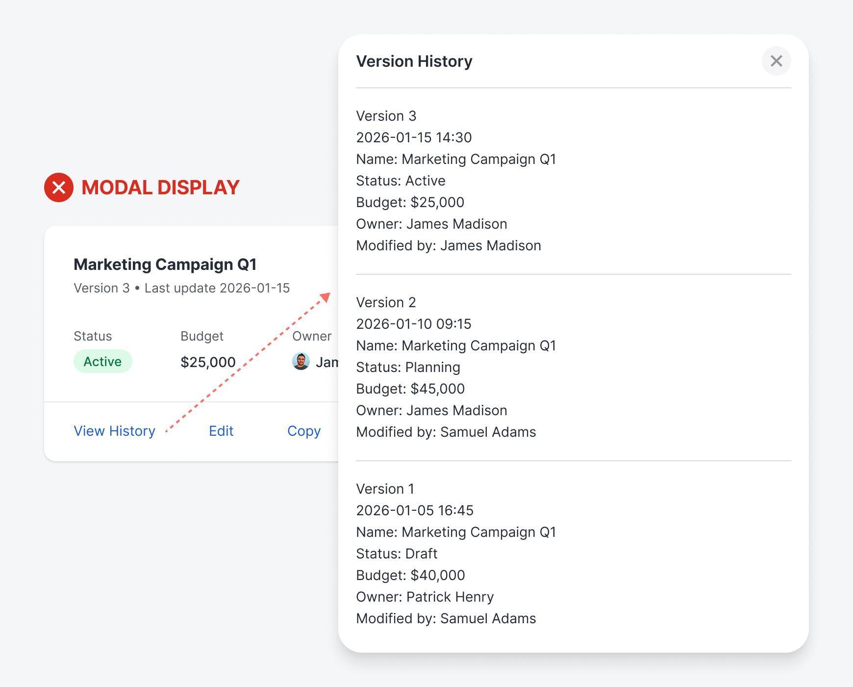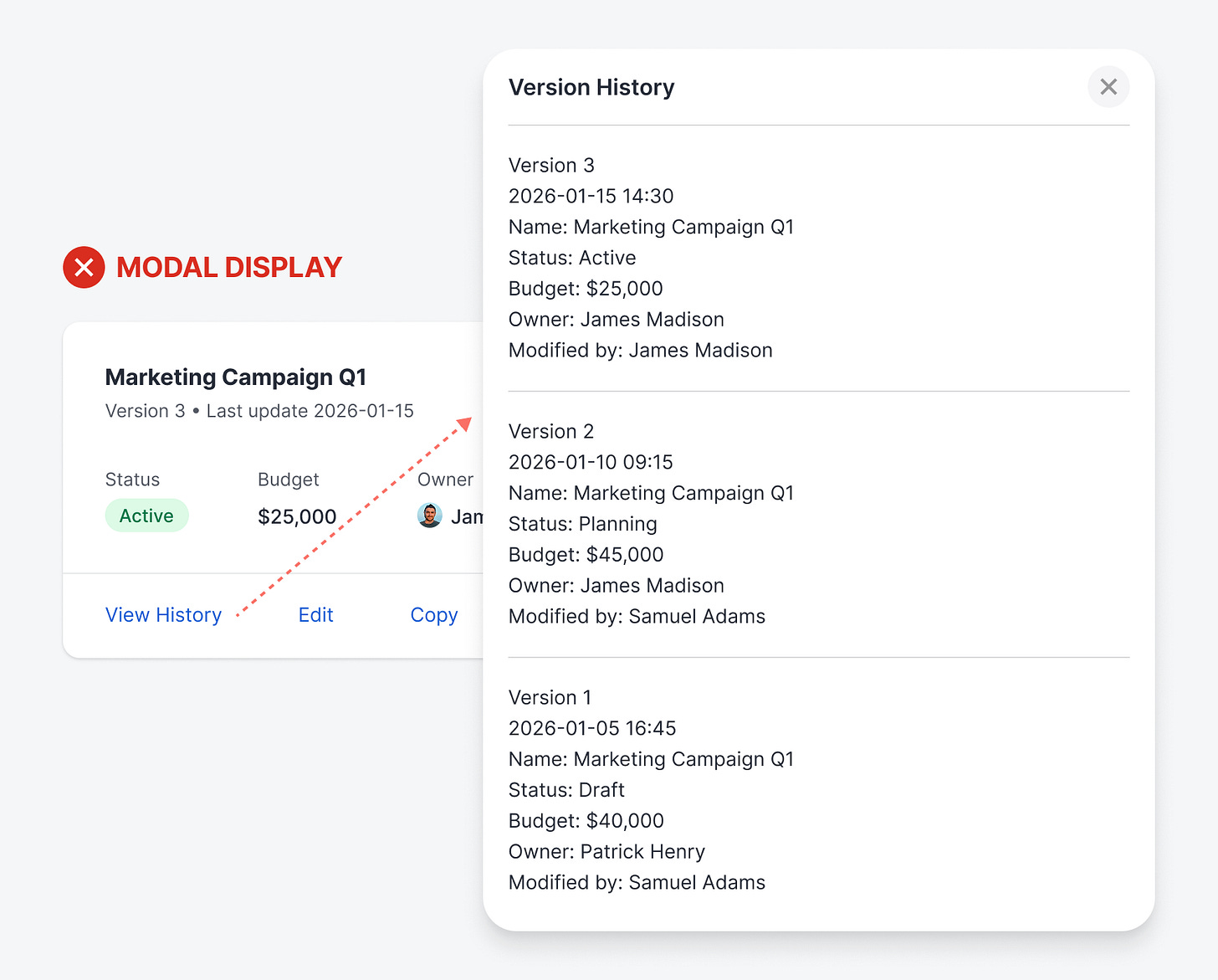 When a modal appears, it obscures the very information users need to make informed decisions. For example, viewing version history in an overlay prevents users from comparing changes against the current state. Instead of seeing all the information they need, they must hold it in their working memory.
