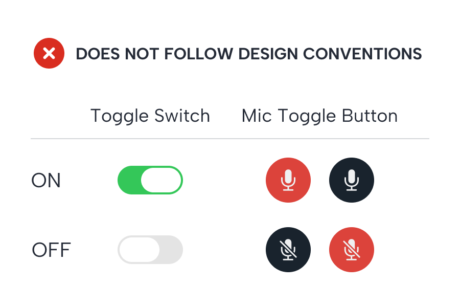 Users need to know for sure that the mic is unmuted when it's on. A red and neutral-colored button fails to do this because of cognitive dissonance. To solve this, you must follow the design convention for toggle switches. A standard toggle switch displays a green cue when it's on and a neutral one when it's off. A red or neutral button to indicate the mic is on violates this convention.