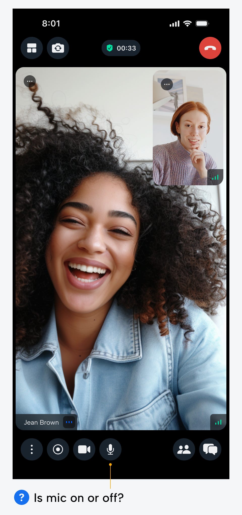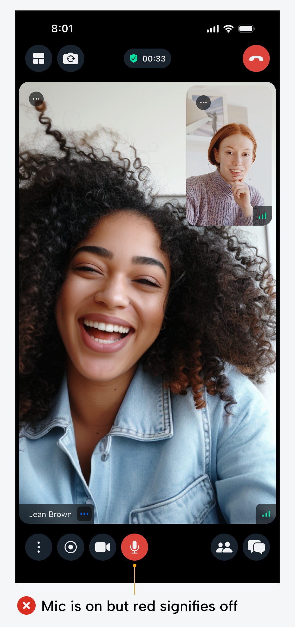 The red slash is enough to make the state clear without dominating the visual space or clashing with the red "End Call" button. The white slash is hard to notice because the microphone glyph is also white. Users can miss this detail and mistakenly think the mic is on. For this reason, the red slash is essential to signify the clearest off state.