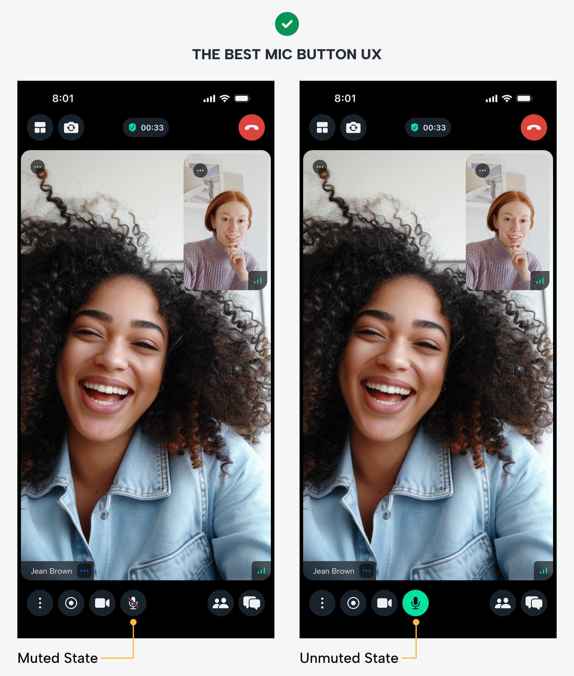 This accidental hot mic moment is the worst mistake a user could make. The UX design of a mic button should prevent these accidents. However, most mic buttons fail to do so because they have confusing and unintuitive on and off states.