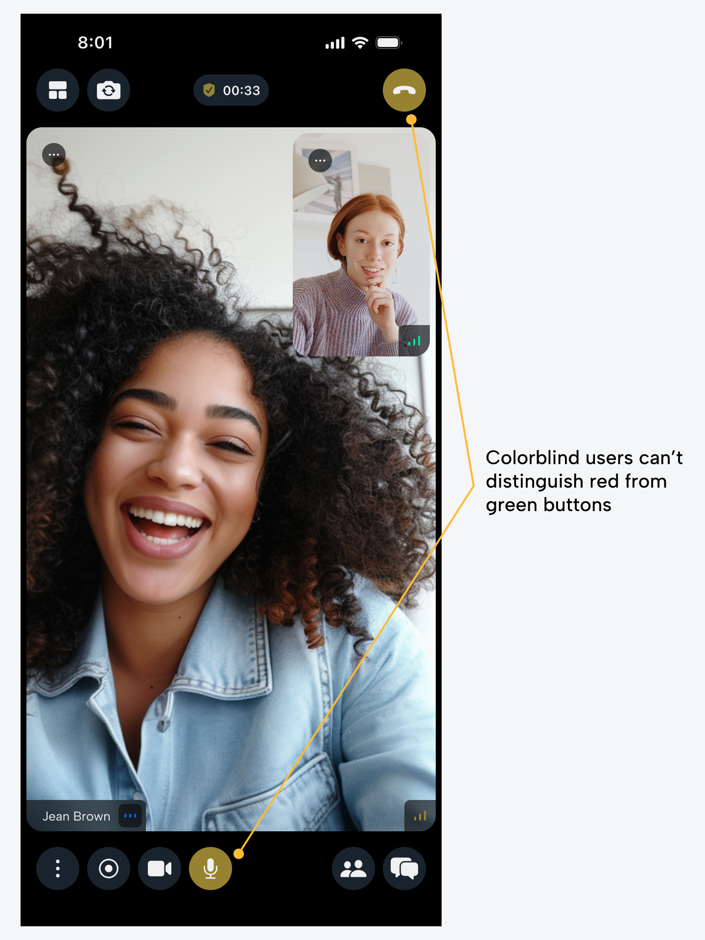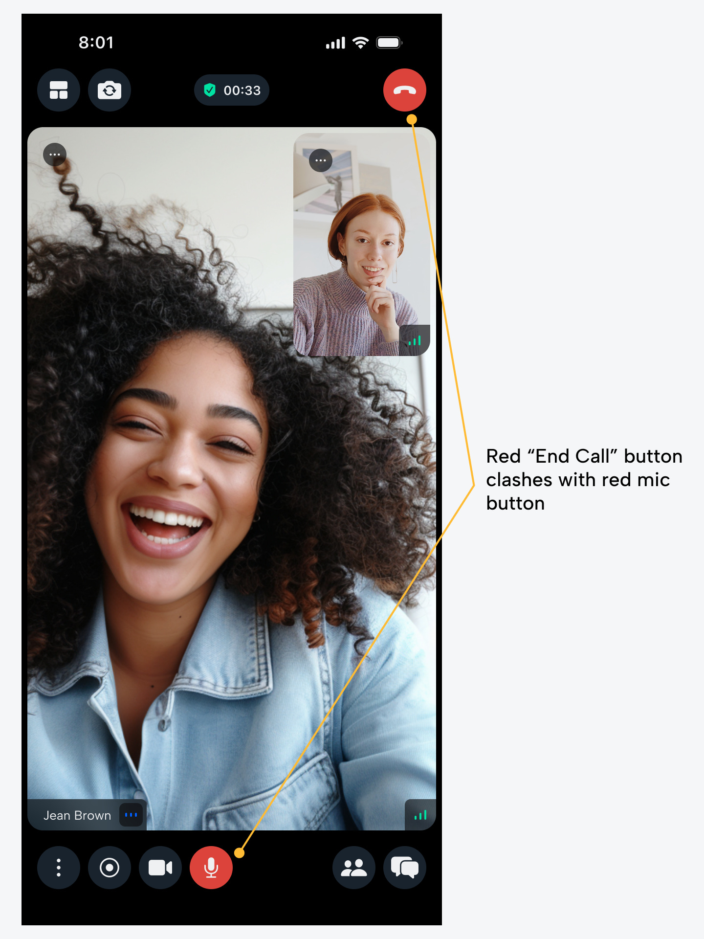 Another issue with the red button is that it clashes with the red "End Call" button. Users could easily mistake one button for the other and click the wrong one. The icons inside the buttons might be different, but users don't always notice minor details before they act.