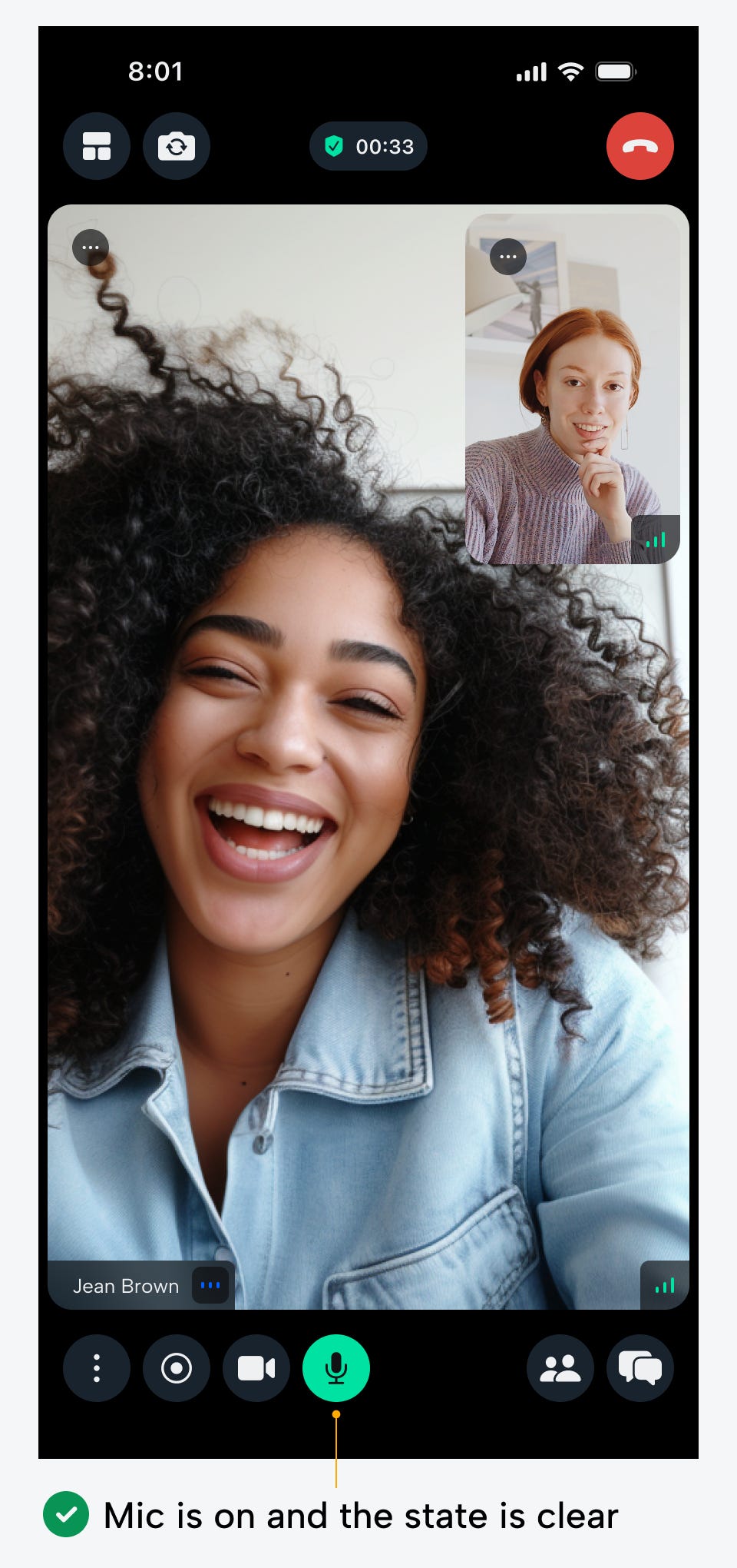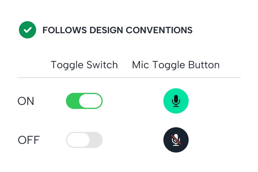 Therefore, the appropriate indicator for an unmuted mic that users expect is actually a green button. Not only does this follow the toggle convention, but it leaves no doubt in the user’s mind that the mic is on. The bright green button dominates the screen for faster state recognition. It only takes a quick glance for them to know whether they should speak.