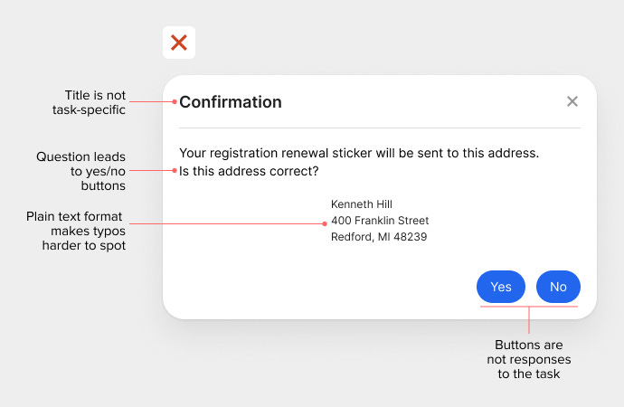 Confirming data is essential when it involves monetary transactions and sensitive items. For instance, ordering a registration renewal sticker requires the user to verify their address. If there are typos, they’ll fail to receive the sticker and could face legal consequences. A modal confirmation dialog is needed to ensure that the address is correct.