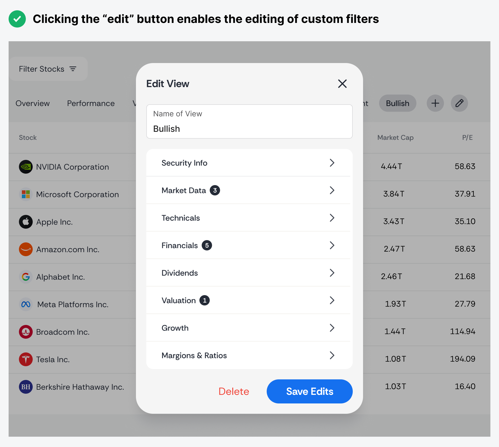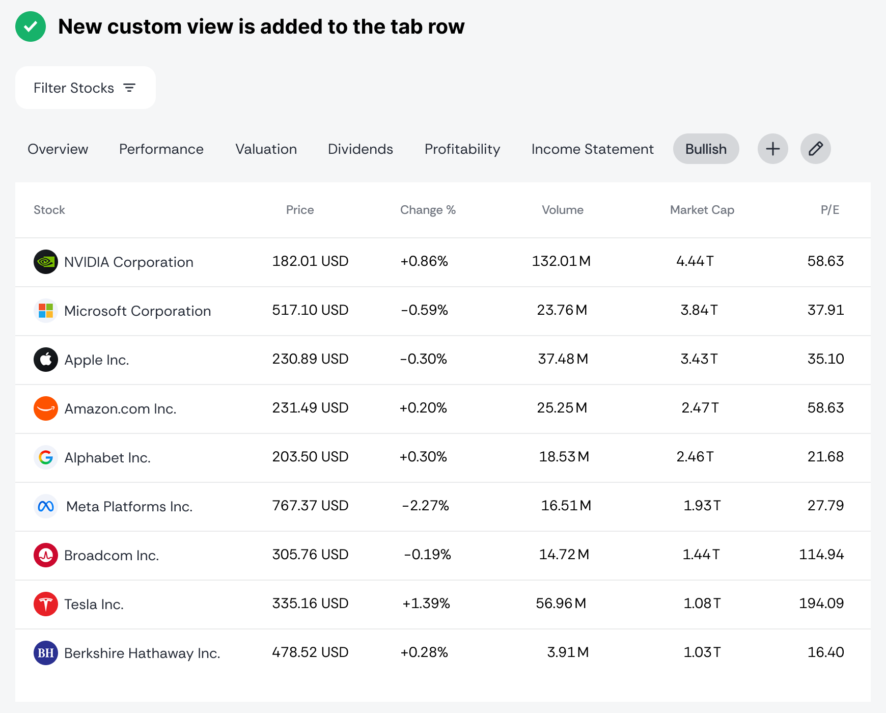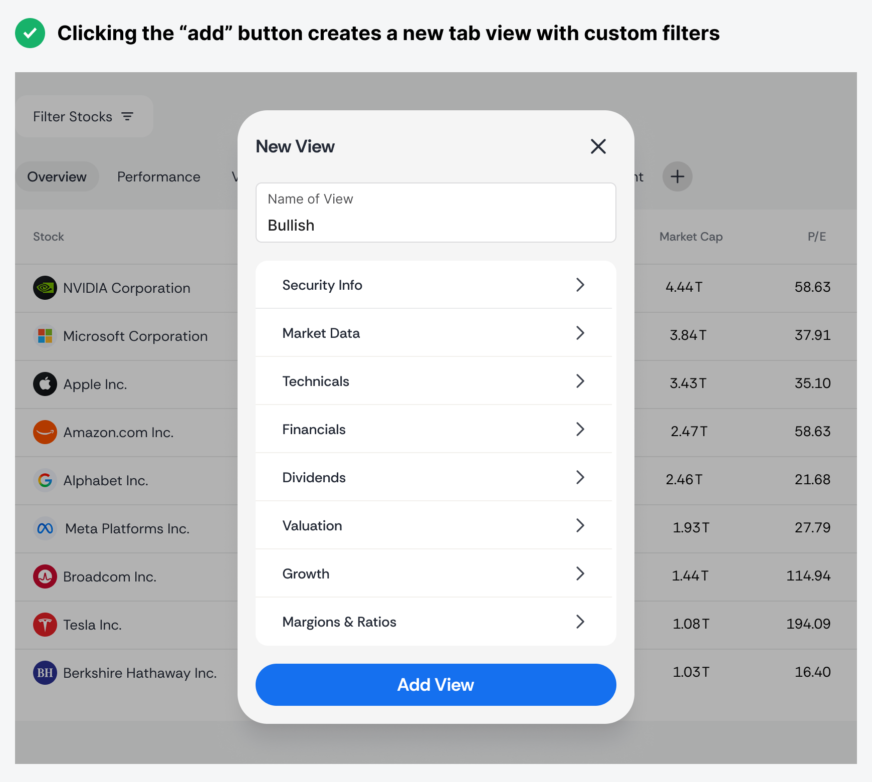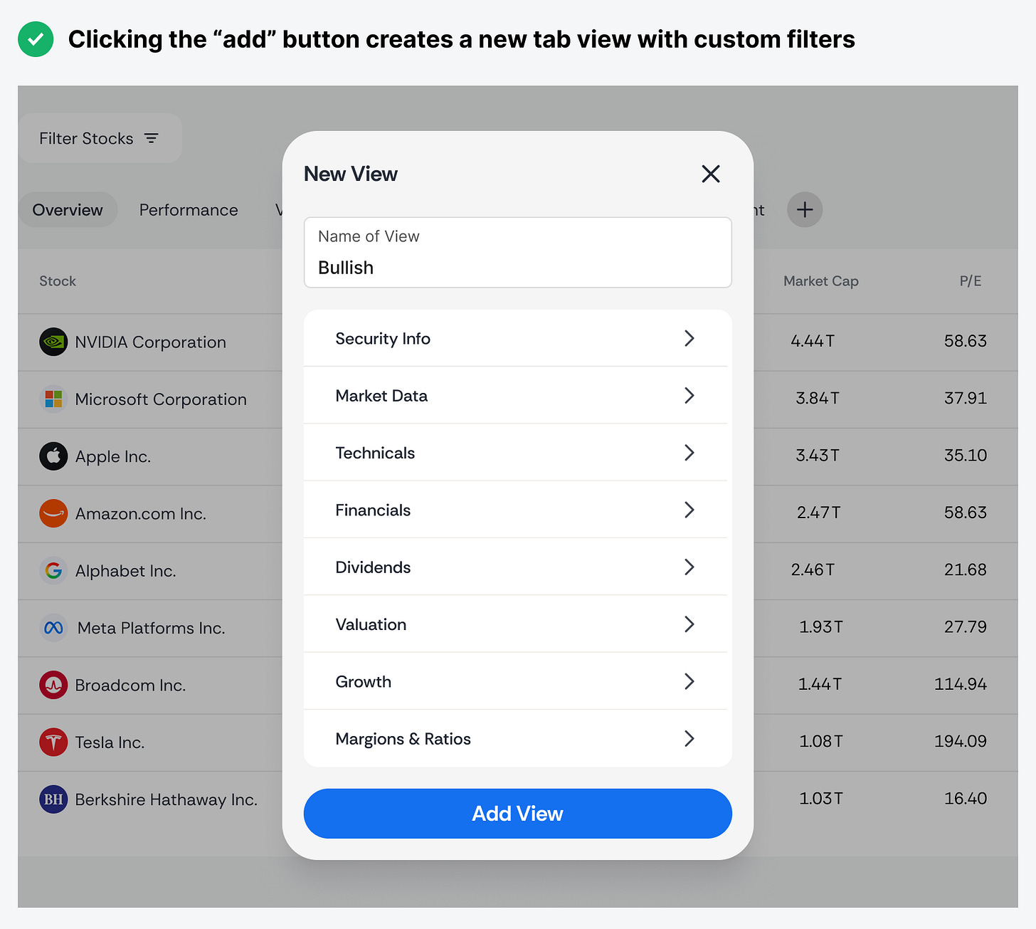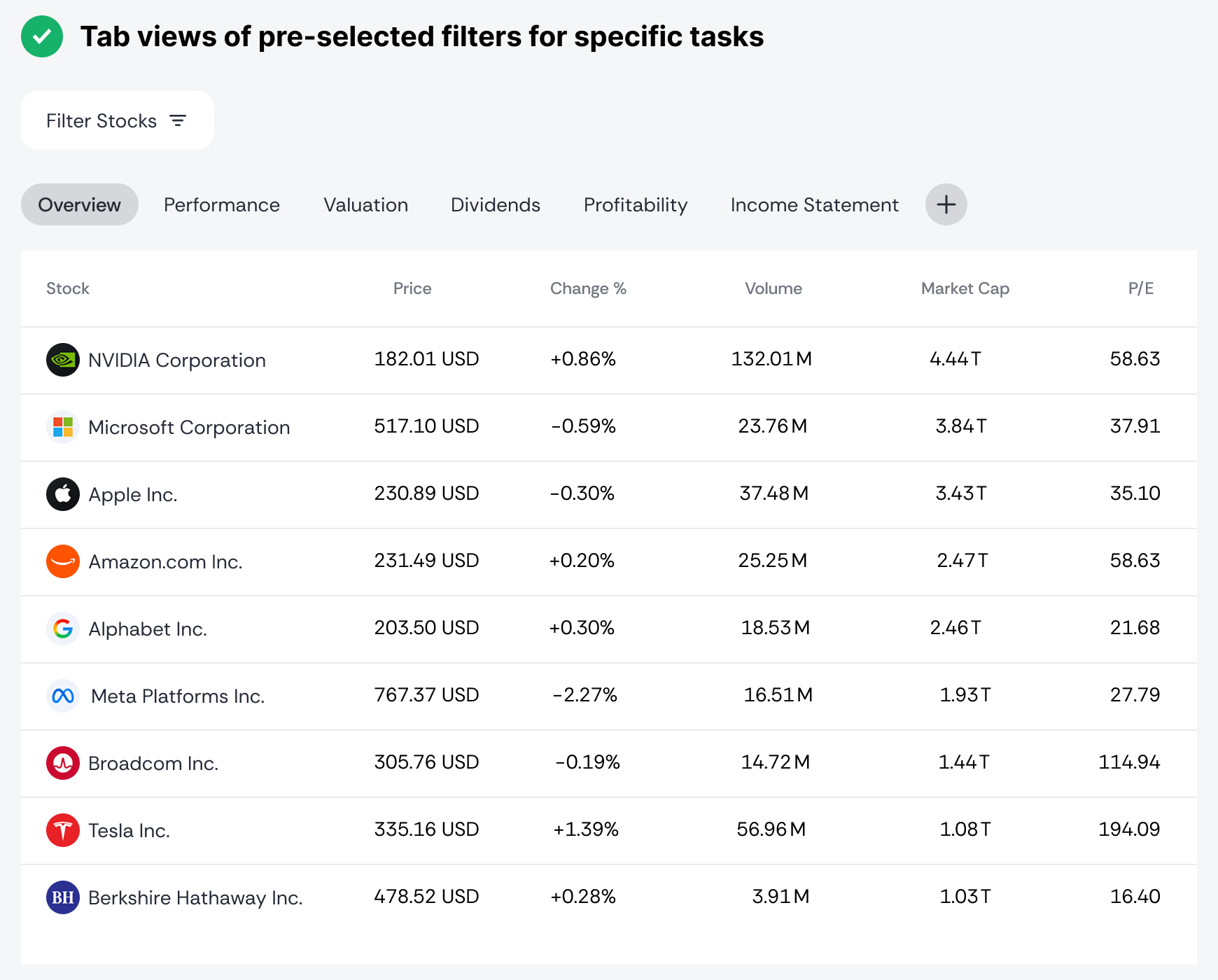 For example, a table for screening stocks might require analyzing the performance, financial, or dividend data. Instead of forcing users to find the appropriate filters for this data, you can pre-select it for them in a tab view.