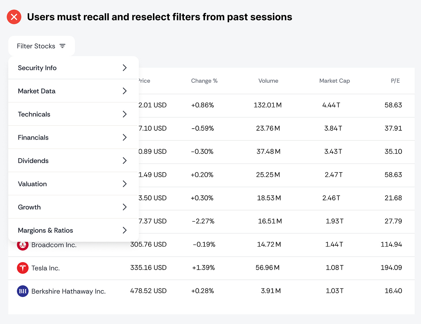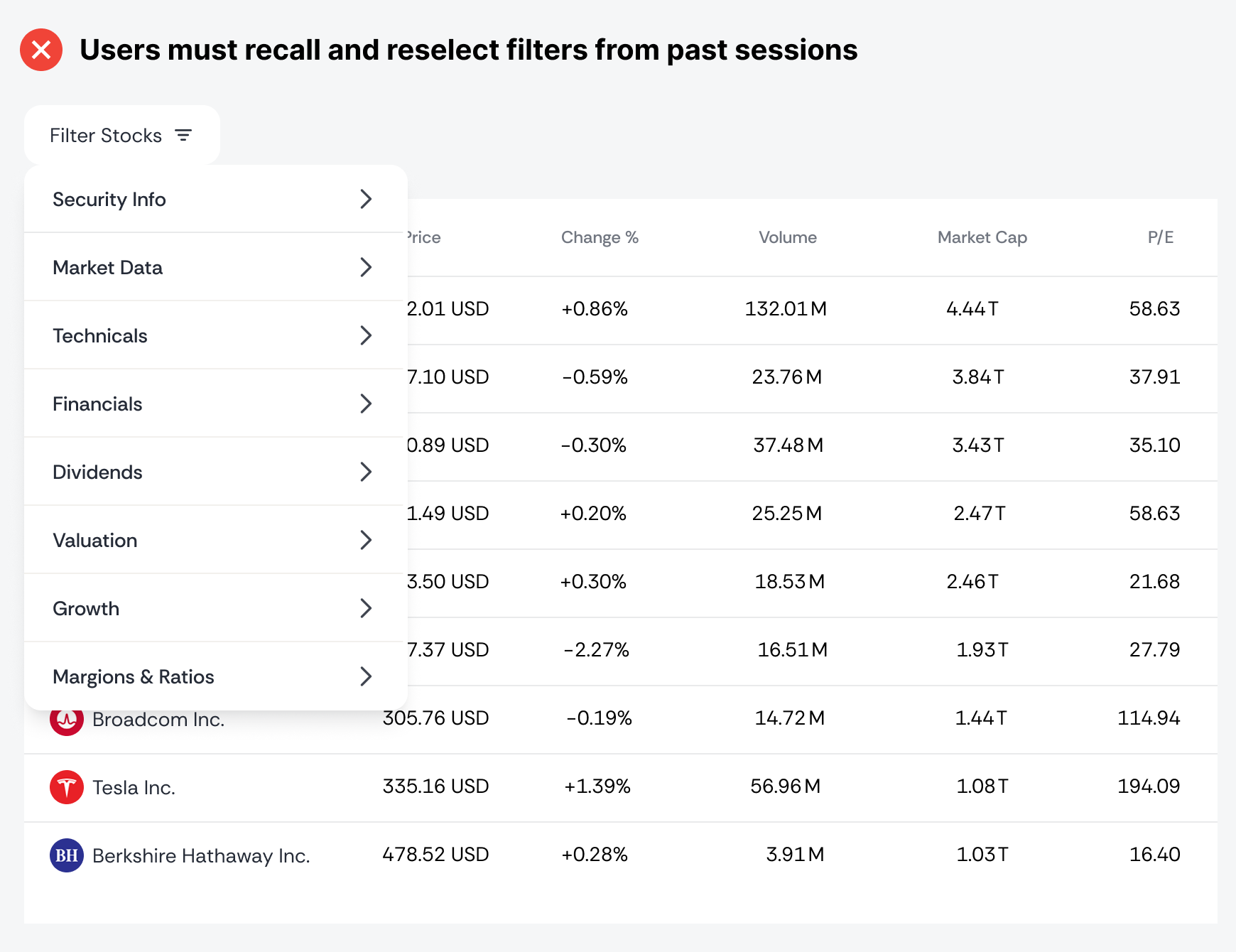 Suppose your app has a large data table with multiple filters. Your users often use different filters for their tasks. However, sometimes they want to reuse their previous filters and build upon them. To do this, they must recall their input values from past sessions and reselect them each time. This scenario frustrates users because it requires more work and imposes a high cognitive load on them.
