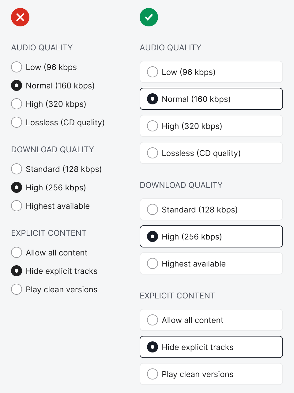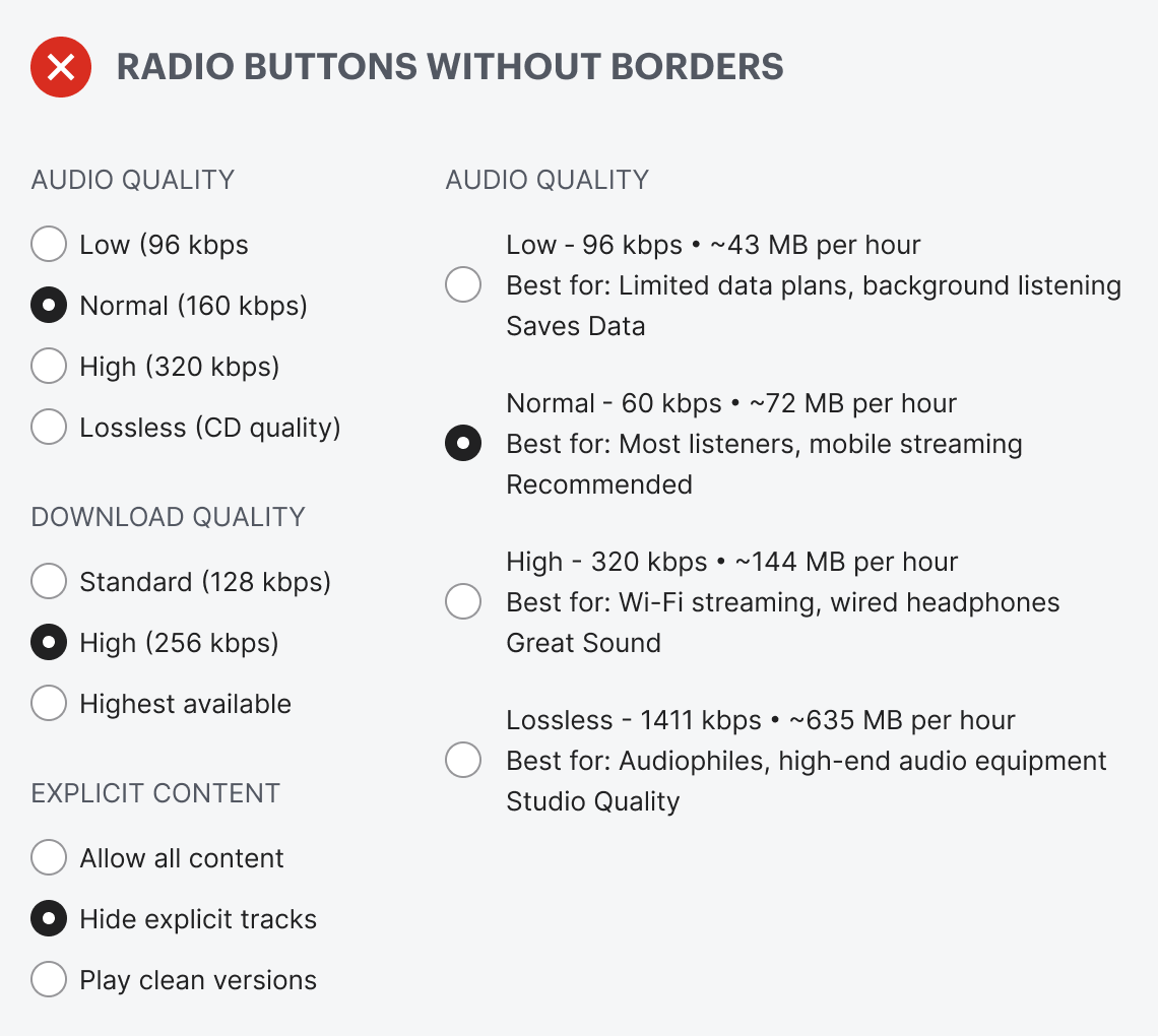 Do your radio buttons have the best user experience? Chances are, they don’t because they don’t have borders. If they don’t have borders, you’re likely making it hard for users to select options on forms and in settings.