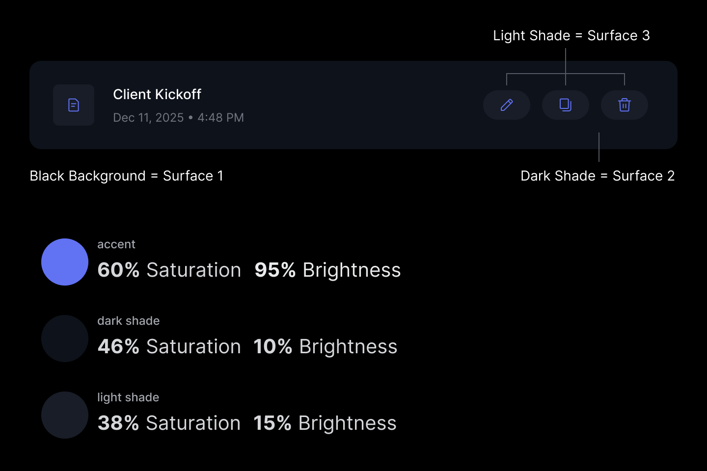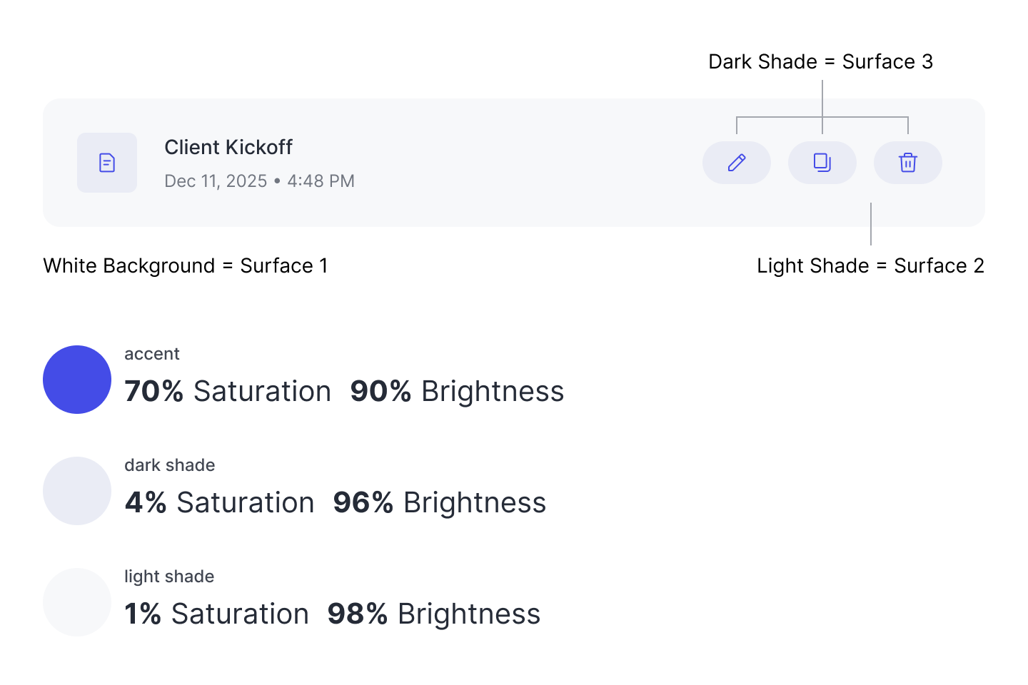 As you can see, the saturation and brightness of the shades vary in tiny increments. You don’t need much variance, since the surface shades are meant to be subtle. On a white background, the light shade should be the first surface layer you use. Any other elements placed on top of the light shade element should use the dark shade. Stacking these surfaces create depth for a better visual experience.