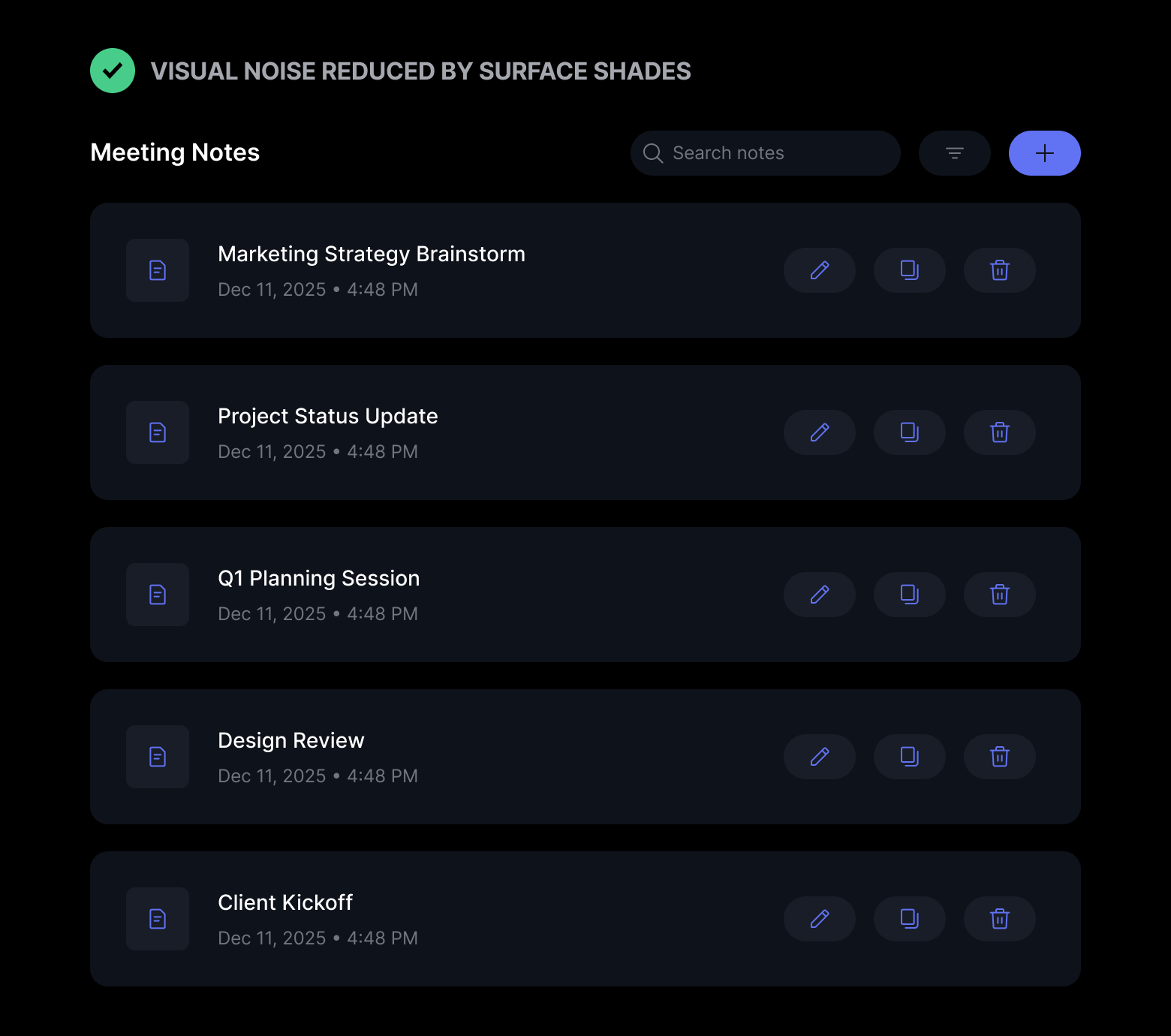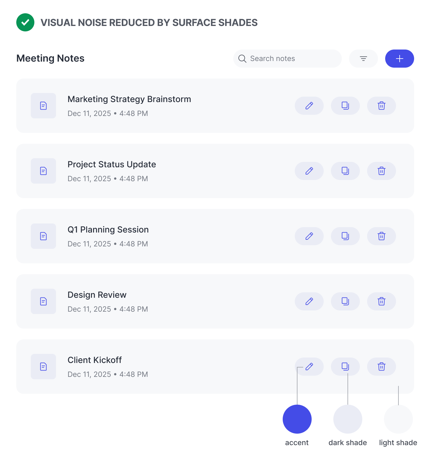 That’s why it’s better to use surface shades over borders. Surface shades are easier on the eyes because they lack harsh edges and blend more easily with the background. Instead of hard lines to distinguish elements, it uses subtle depth to make a two-dimensional design feel three-dimensional.